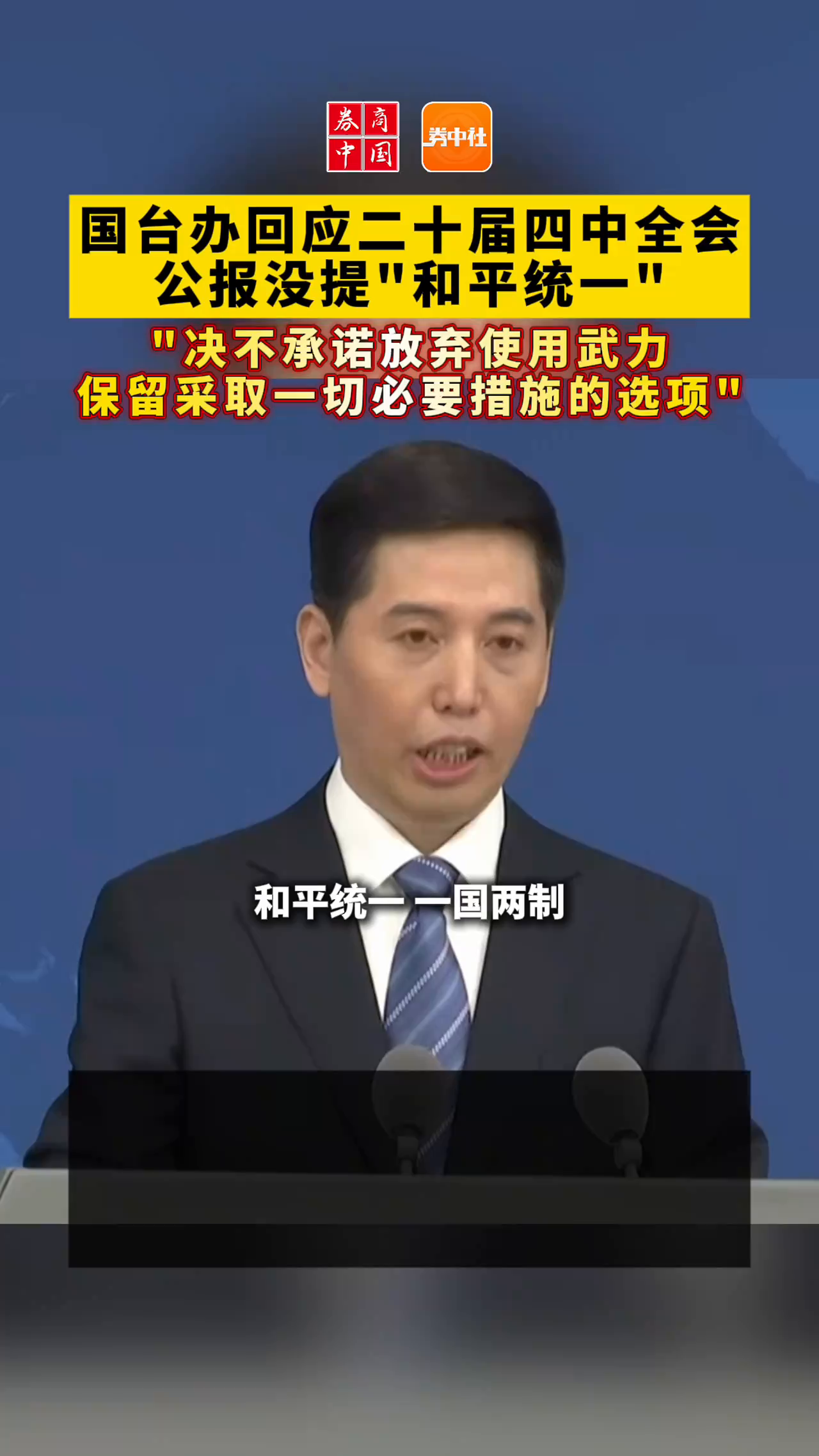 国台办回应二十届四中全会公报没提“和平统一”:决不承诺放弃使用武力,保留采取一切必要措施的选项