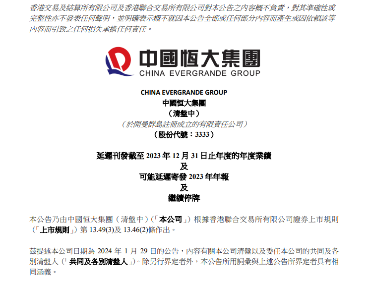 中国恒大的清盘人宣布,预计2023年年报亦将延迟寄发,原因是“由于共同及各别清盘人现正在查明公司目前事务状况,编制公司截至2023年12月31日止年度的财务报表以及刊发2023年度业绩有所延迟”。