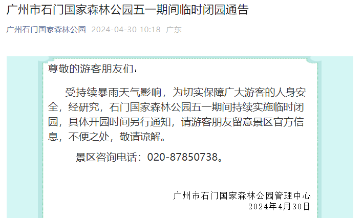 此前,受天气影响,广州多个景区在五一假期临时闭园,包括广州市流溪河国家森林公园、广州石门国家森林公园、广州市帽峰山景区、广东太子森林公园等。
