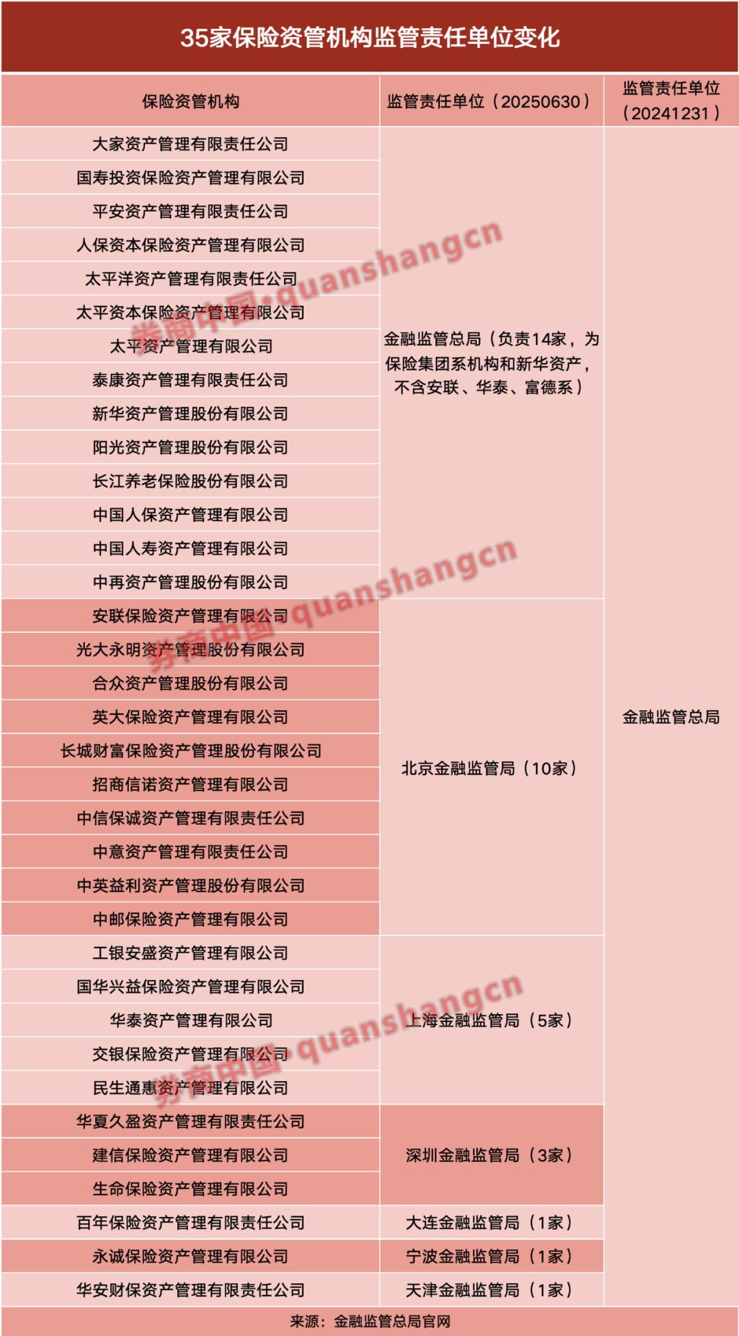 14家由总局监管:人保资产、国寿资产、平安资管、中再资产、泰康资产、太保资产、太平资产、新华资产、长江养老、大家资产、阳光资产、国寿投资、人保资本、太平资本。