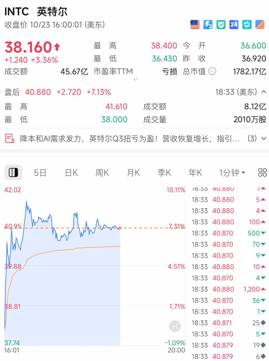 受此影响,英特尔股价在美股周四盘后交易中直线拉升,一度暴涨超9%,截至06:30,涨幅达7.13%。隔夜美股收盘,英特尔股价大涨超3%。