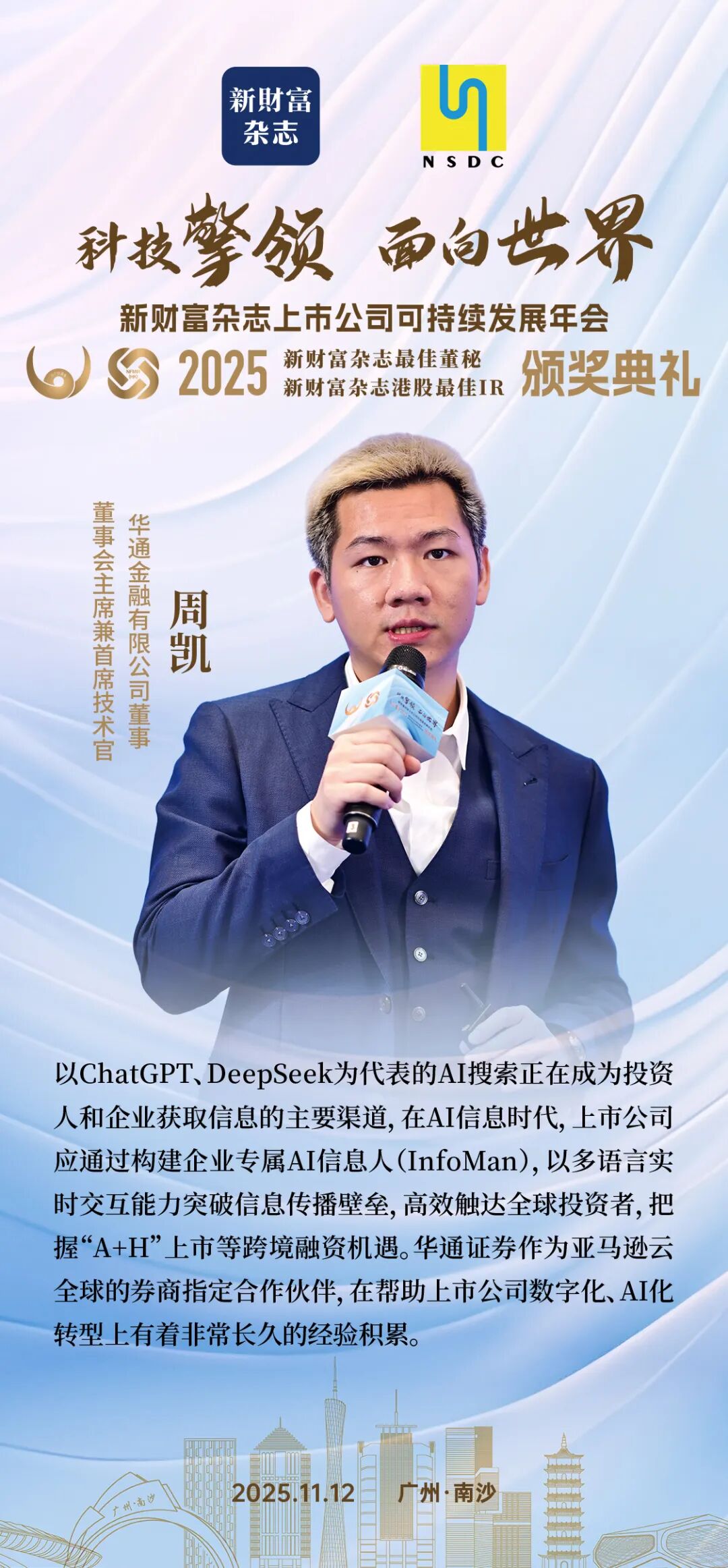 周凯介绍,以ChatGPT、DeepSeek为代表的AI搜索正在成为投资人和企业获取信息的主要渠道,在AI信息时代,上市公司应通过构建企业专属AI信息人(InfoMan),以多语言实时交互能力突破信息传播壁垒,高效触达全球投资者,把握“A+H”上市等跨境融资机遇。华通证券作为亚马逊云全球的券商指定合作伙伴,在帮助上市公司数字化、AI化转型上有着非常长久的经验积累。