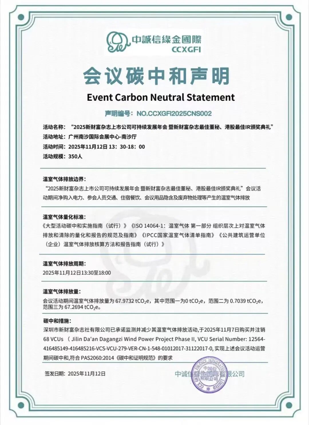 值得一提的是,本次会议严格践行低碳理念,已获得中城信绿金国际核发的会议碳中和声明。在筹备和举办全过程中,大会全面贯彻可持续发展要求,系统监测并努力减少温室气体排放,最终实现会议碳中和。年会以务实行动赋能绿色发展,彰显资本市场的责任远见。