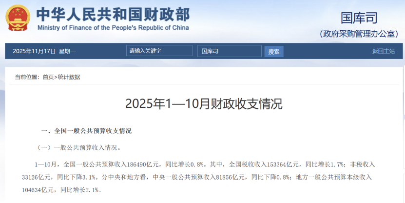 数据显示,今年前10个月,全国一般公共预算收入18.65万亿元,增长0.8%,增幅比前9个月提高0.3个百分点。其中,全国税收收入15.34万亿元,增长1.7%,增幅比前9个月提高1个百分点;非税收入3.31万亿元,同比下降3.1%。前10个月,全国一般公共预算支出22.58万亿元,同比增长2%。