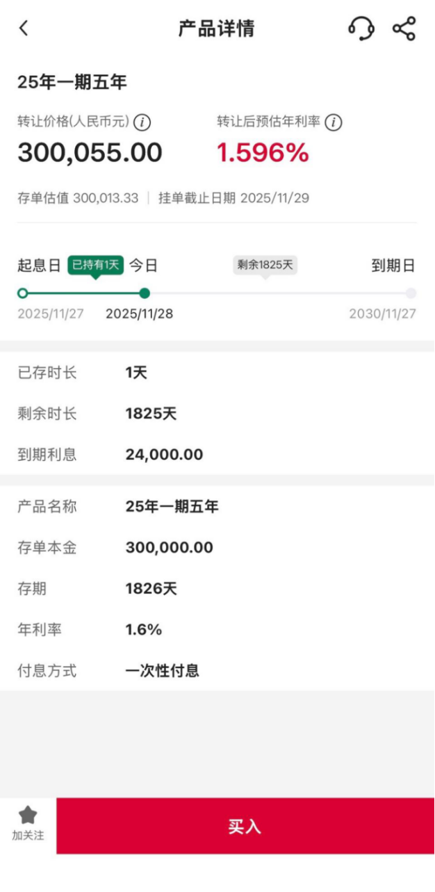 今年中国银行发售了一期大额存单,根据5月20日发布的发售公告,本期大额存单包括1个月、3个月、6个月、1年、2年、3年、5年共计七个期限。截至11月28日,在售产品列表中已无5年期产品类型。但存单转让列表中仍有少量5年期。