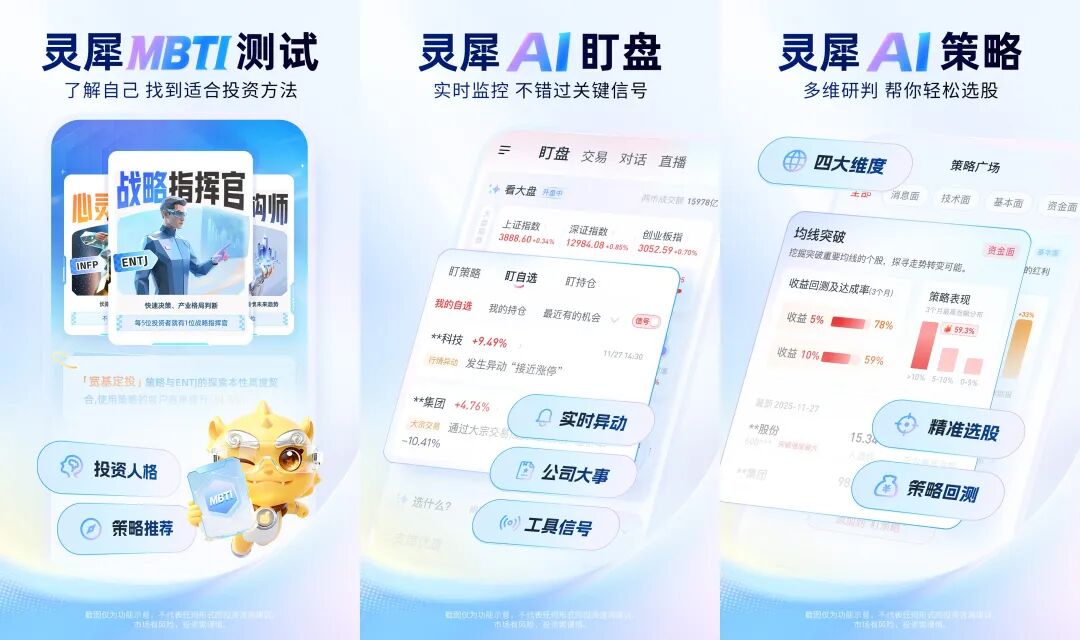 智投护航,省心投资,AI服务贯穿投资闭环。灵犀APP 2.0将君弘智投专业策略转化为匹配用户需求的解决方案,为用户提供贯穿“投前、投中、投后”的全流程智慧陪伴与策略跟踪,助力提升长期投资胜率,共享经济和资本市场发展红利。AI盯盘构建融合“大盘研判-个人诊断-策略跟踪”的一站式投资决策引擎。“选什么”将风靡全球的MBTI测试与投资人格相结合,让用户先知己、再决策;“看大盘”深度分析市场风向,自动监控重要市场信息,辅助评估投资时机;“盯策略”提供覆盖基本面、技术面、消息面、资金面的十余种智投策略,并实时监控策略、自选、持仓等重要信号,让投资决策更从容。