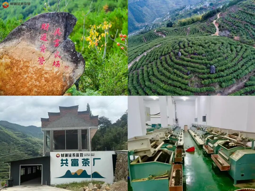 图:财通资管员工认领的“共富茶园”;蔡源乡联合财通资管共建的“共富茶厂”投产