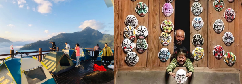 图:永兴村发展茶旅露营活动;蔡源乡“蔡和班”非遗脸谱