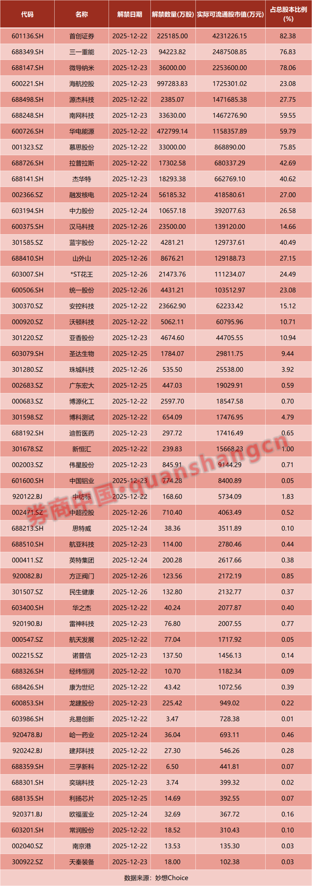 从解禁占比来看,解禁占比居前三位的是:首创证券(82.38%)、微导纳米(78.06%)、三一重能(76.83%)。