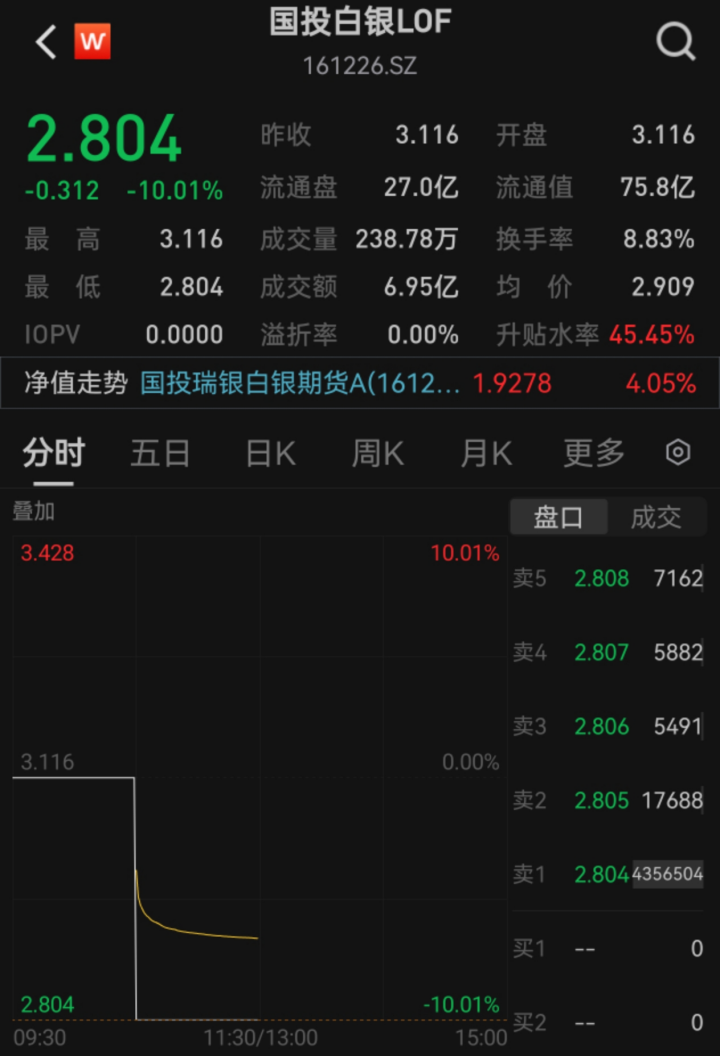 12月25日早盘,国投白银LOF复牌封跌停,封单金额超10亿元,成交金额超过6亿元,溢价率收窄至45%。