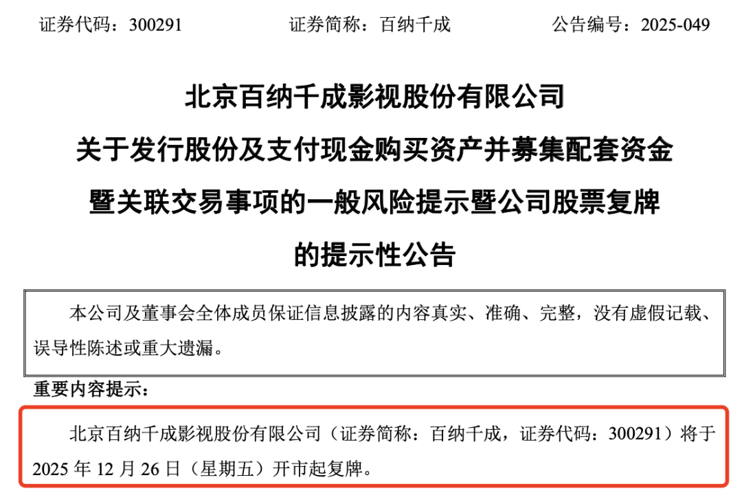 因筹划本次交易事项,百纳千成已于12月16日开市起停牌。根据深圳证券交易所相关规定,经公司申请,公司股票将于2025年12月26日(星期五)开市起复牌。