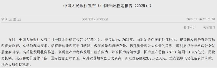 12月26日,中国人民银行发布《中国金融稳定报告(2025)》(下称《报告》),对中国金融体系的稳健性状况进行全面评估。《报告》指出,当前,我国金融业运行总体稳健,金融风险整体收敛、总体可控,金融机构经营指标和监管指标处于合理区间。