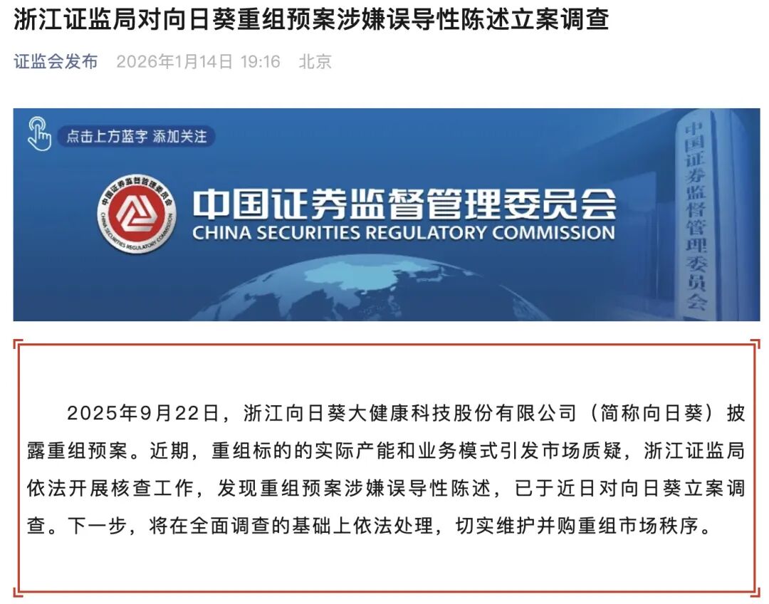 1月14日晚间,据证监会公告,2025年9月22日,浙江向日葵大健康科技股份有限公司(简称向日葵)披露重组预案。近期,重组标的的实际产能和业务模式引发市场质疑,浙江证监局依法开展核查工作,发现重组预案涉嫌误导性陈述,已于近日对向日葵立案调查。下一步,将在全面调查的基础上依法处理,切实维护并购重组市场秩序。