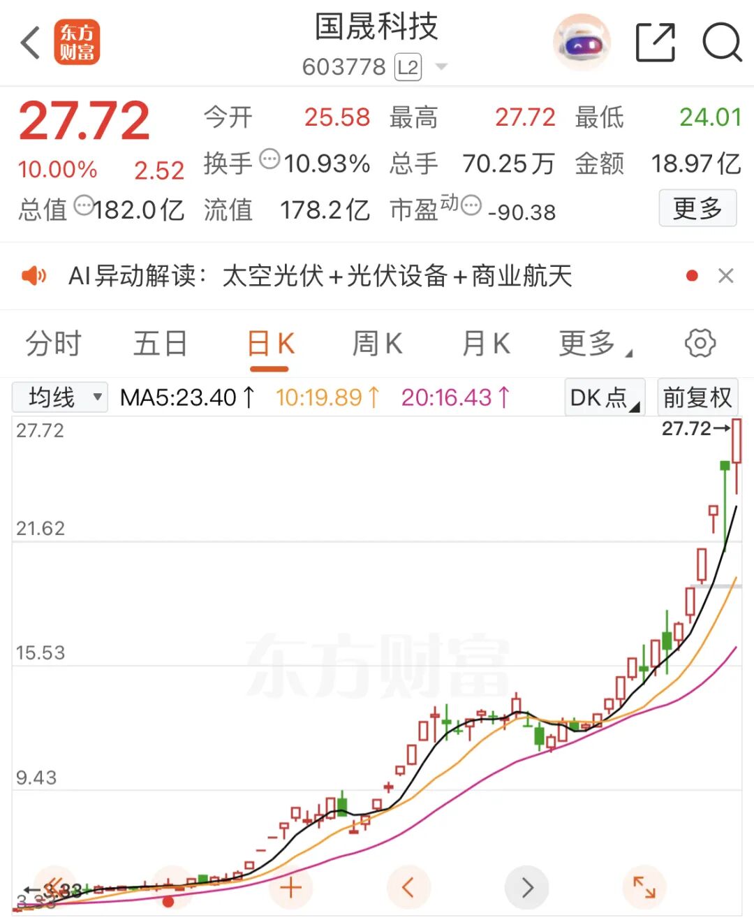近期,国晟科技股价不断突破,自2025年10月31日至今,累计上涨511.92%。截至1月14日收盘,该股10%涨停,股价报27.72元,成交金额18.97亿元,换手率10.93%,总市值达182亿元。