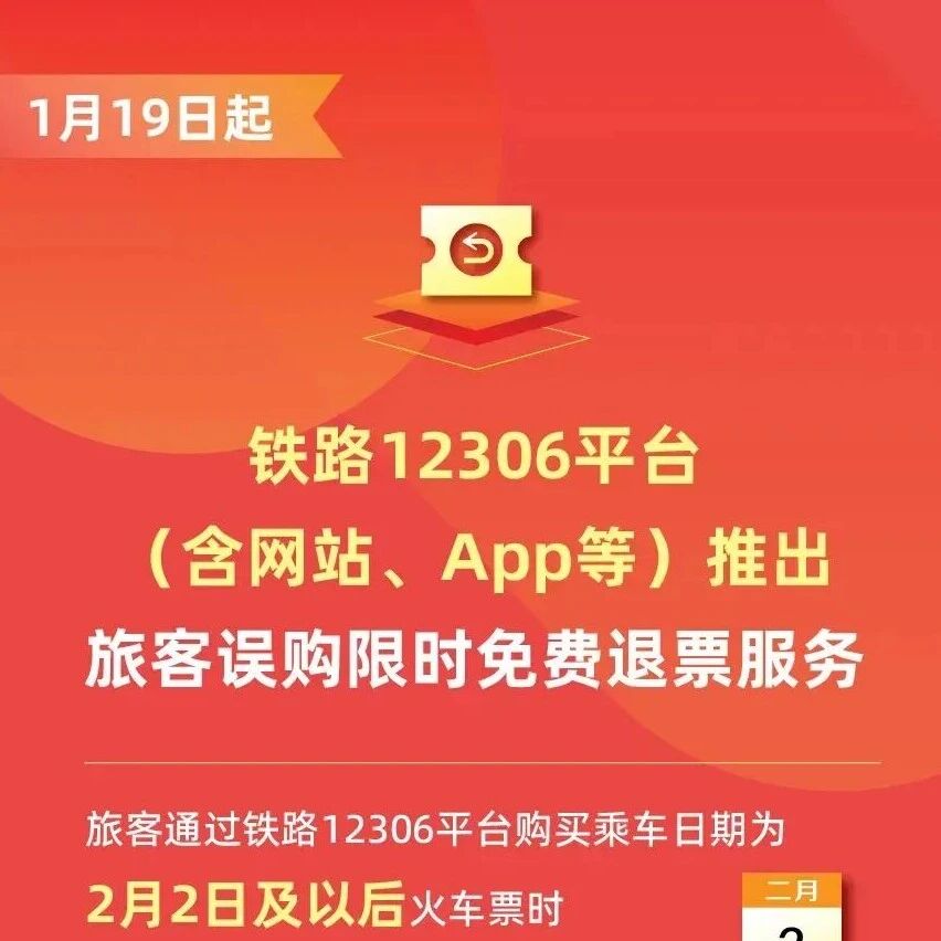1月19日起,铁路12306平台(含网站、App等)推出旅客误购限时免费退票服务,旅客通过铁路12306平台购买乘车日期为2月2日及以后火车票时,如误购车票在购票支付成功30分钟内且在开车前4小时以上,购票人可线上自助办理退票,不收取退票费,将进一步提升旅客购票体验。