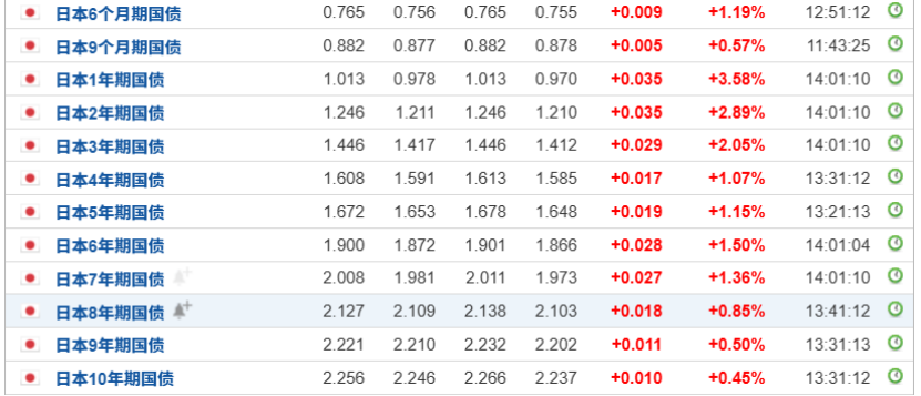 此外,今日午后,日本债市普遍再度杀跌。日本2年期国债收益率升至1.246%,日本10年期国债收益率升至2.256%。但15年及以上期限国债表现尚可。