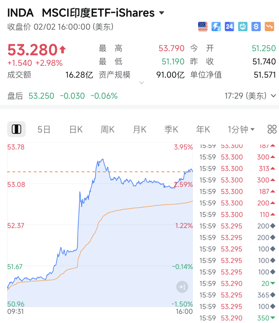 当地时间2月2日,美国总统特朗普宣布,美国对印度的“对等关税”将从25%降至18%,印度将相应降低对美关税和非关税壁垒,直至降至零,并承诺购买价值超过5000亿美元的美国能源等产品。受此影响,在美上市的印度ETF(iShares MSCI India ETF)在盘中直线拉升,一度大涨近4%;印度卢比兑美元汇率亦大幅拉升,日内一度大涨超1%。