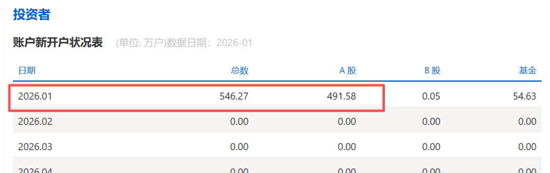 对比过往数据,今年1月单月新增近481.58万户,该数据轻松超越了2025年所有月份的水平,甚至高于2025年1月和2月前两个月合计新增开户数440.59万户。