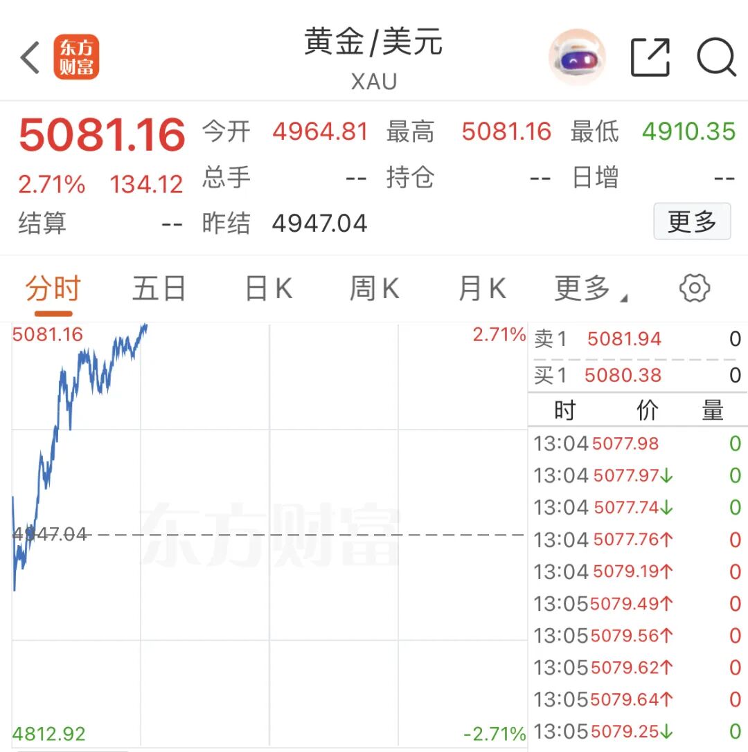 今日,现货黄金突破5000美元/盎司,截至发稿,日内涨超2%。