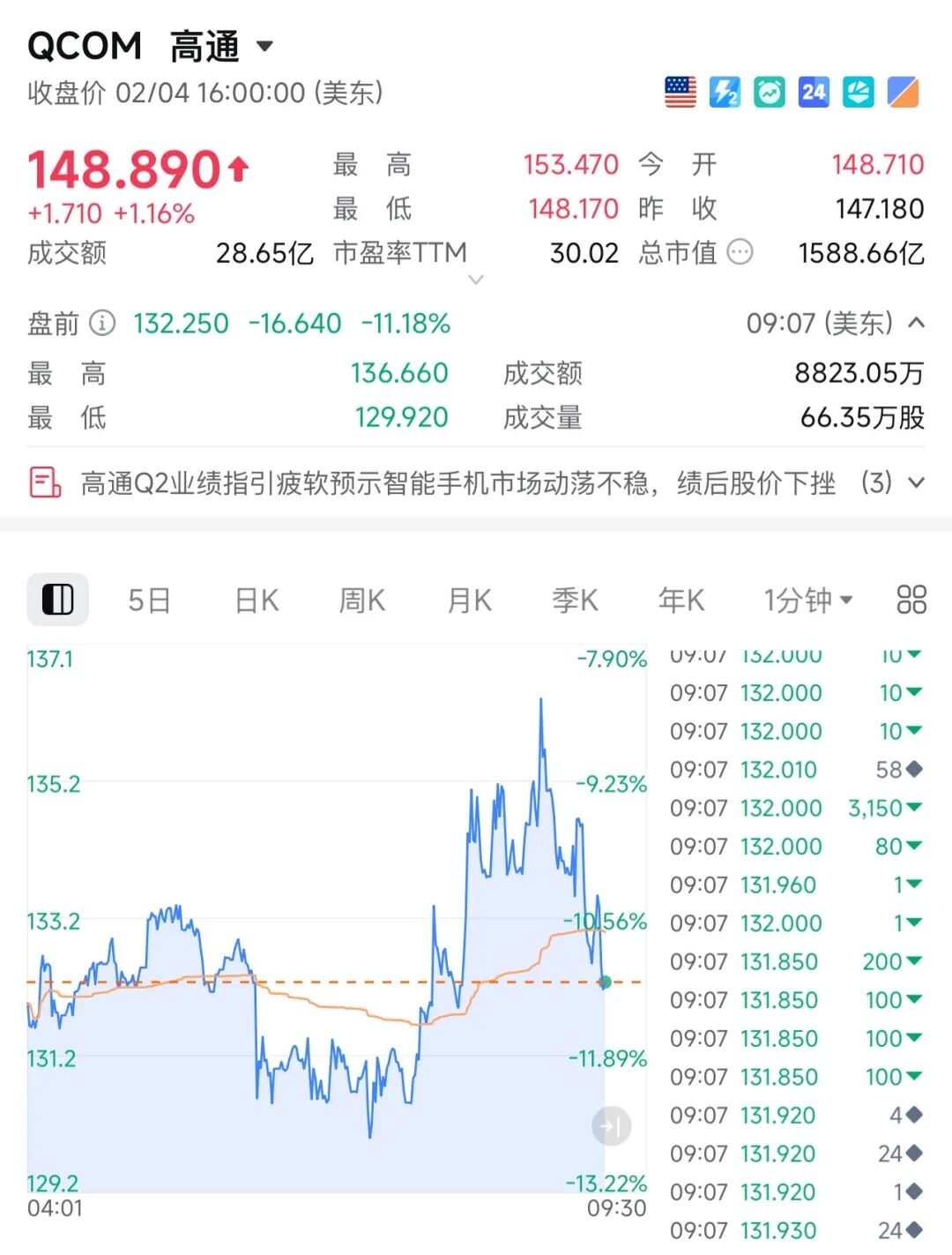 北京时间2月5日,在美股盘前交易中,美国芯片巨头高通股价大幅跳水,一度暴跌超12%,截至发稿,跌幅仍达11.18%。
