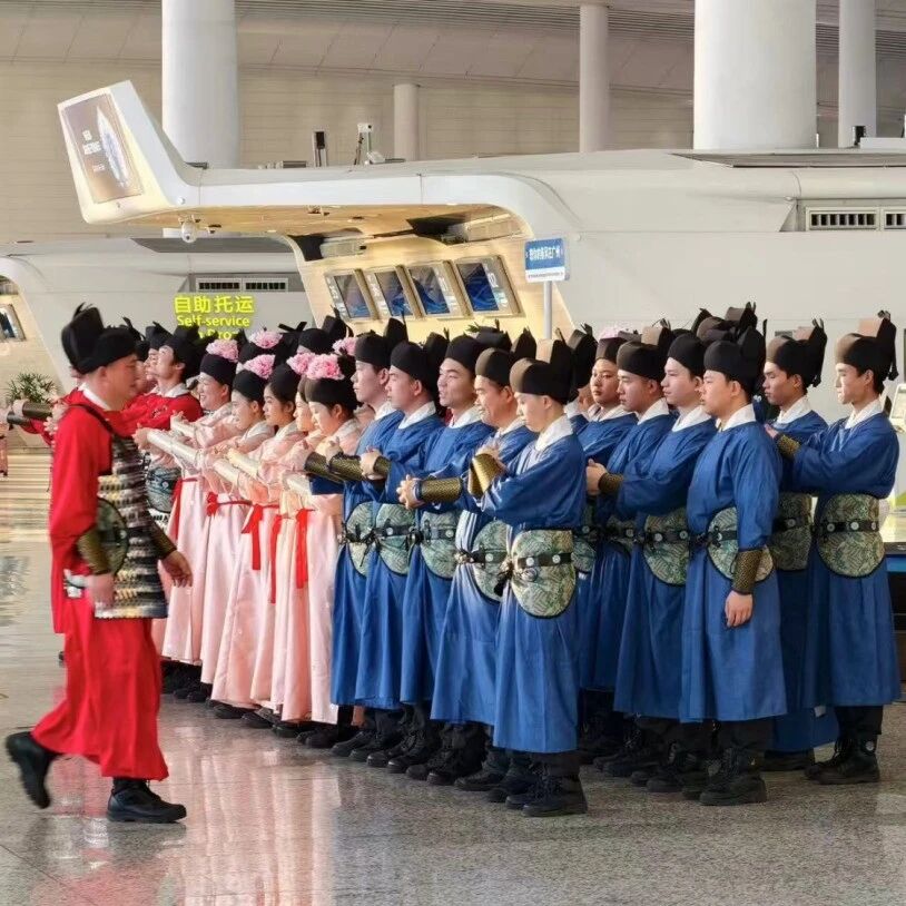 进入2月份,广州白云机场T1的值勤人员就纷纷换上了宋代襕衫,寓意向旅客“送福”(谐音“宋服”)。