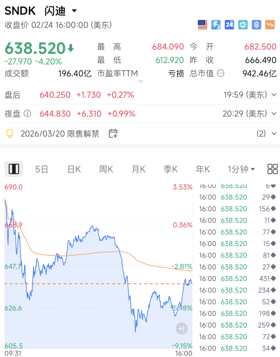 受此影响,闪迪股价盘中大幅跳水,一度暴跌超8%,最终收跌4.2%,报638.52美元。