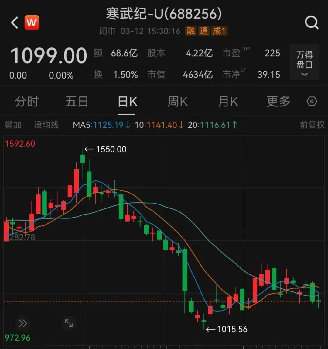 此外,寒武纪2025年年报还显示,第五大股东章建平持仓增加40.84万股至681.49万股,占流通比例1.62%,按今日收盘价1099元计算,章建平持仓金额近75亿元。