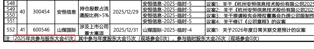 根据万家基金的年度投票结果,2025年该公募一共参与过41次股东会(均为网络形式参加),包括15次年度股东会和26次临时股东会。41次股东会源于20多家上市公司,包括了锡业股份、中远海能、建设银行、寒武纪等公司;41次股东会的投票议案,涵盖利润分配、担保授信、定增发行、资产重组等552条相关议案或事项。