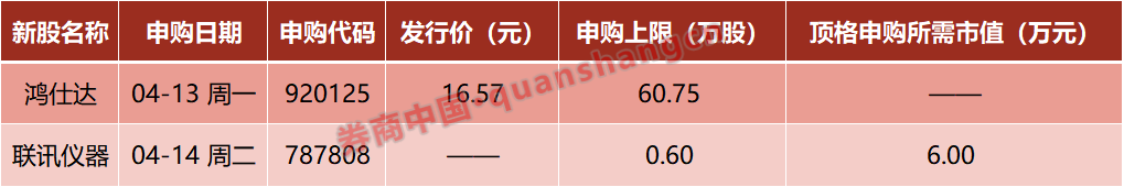 本周(4月13日—4月17日)有2只新股发行,周一:鸿仕达 ;周二:联讯仪器。