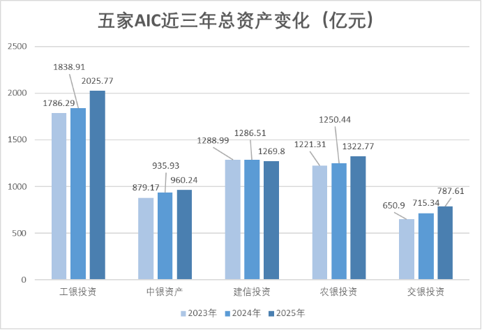 从资产规模看,五家AIC整体呈现扩张态势。截至2025年末,工银投资总资产突破2000亿元大关,达2025.77亿元,同比增长10.16%,资产规模稳居行业首位;农银投资总资产1322.77亿元,同比增长5.78%;交银投资总资产787.61亿元,同比增长10.1%;中银资产总资产960.24亿元,同比微增2.6%;建信投资总资产1269.8亿元,受业务结构调整影响,同比下降1.3%。
