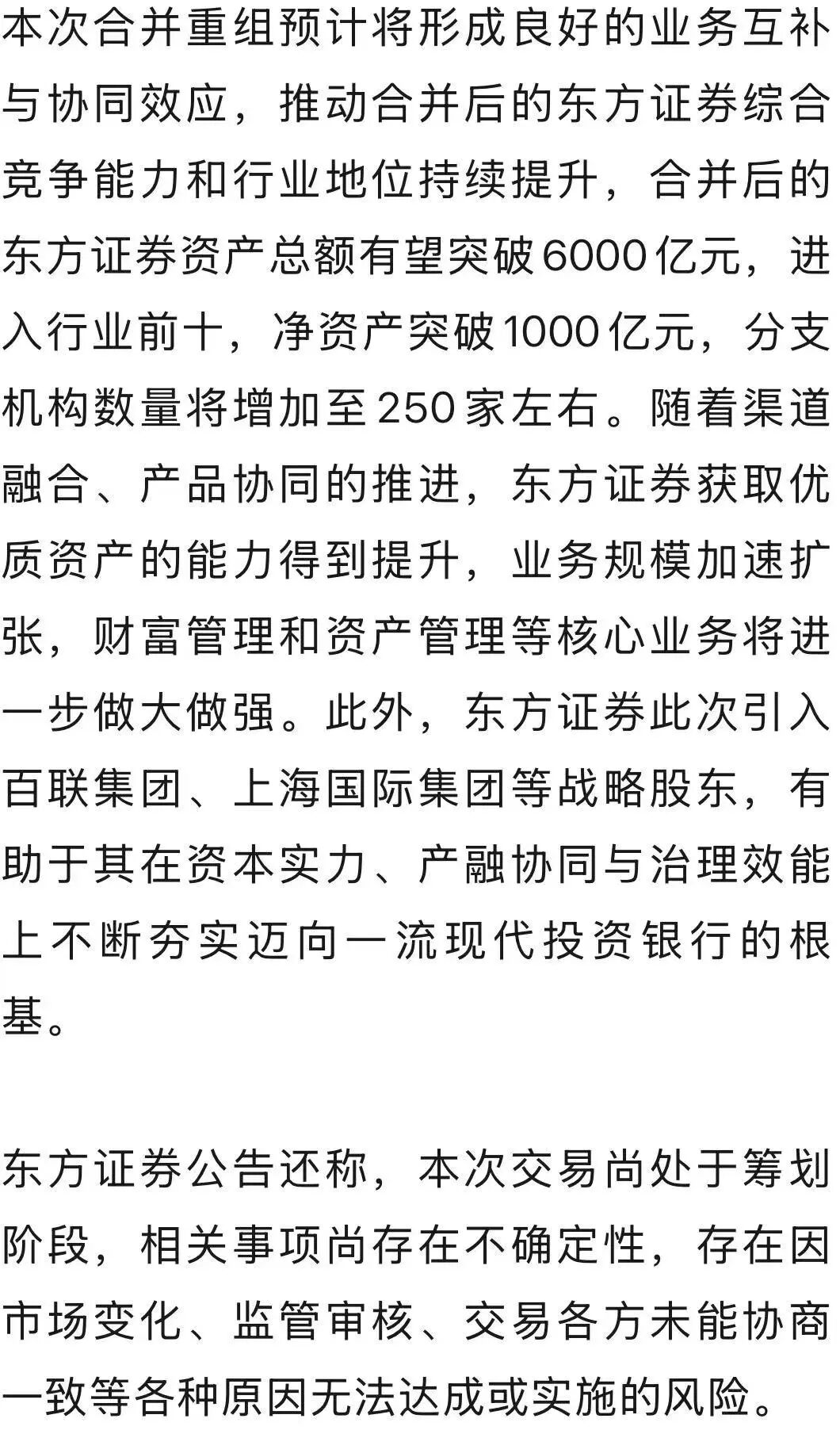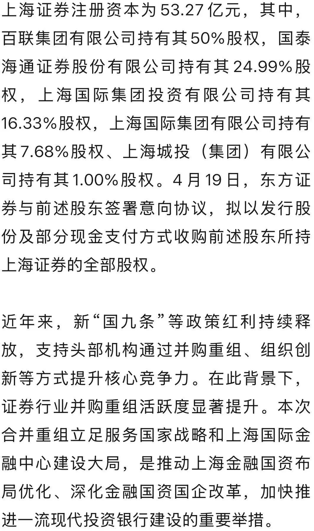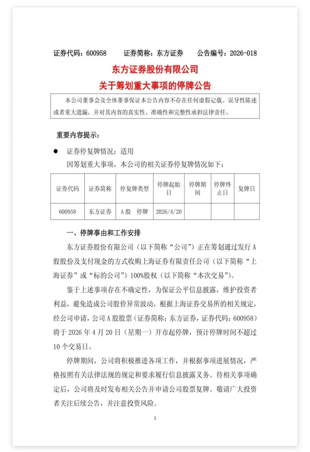 4月19日下午,东方证券A股发布筹划重大事项的停牌公告称,公司正在筹划通过发行A股股份及支付现金方式收购上海证券100%股权事宜,东方证券A股股票将于4月20日开市起停牌,预计停牌时间不超过10个交易日。
