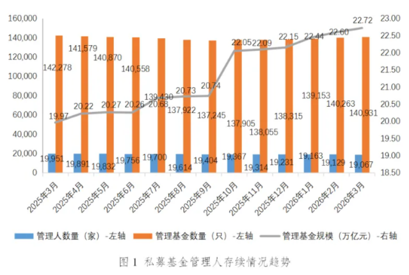 4月20日,中国证券投资基金业协会发布了最新一期《私募管理人登记及产品备案月报》。数据显示,截至2026年3月末,私募基金存续总规模已达到22.72万亿元,再度创下历史新高。这已经是私募基金规模连续6个月创新纪录,显示出行业稳步扩张的势头。