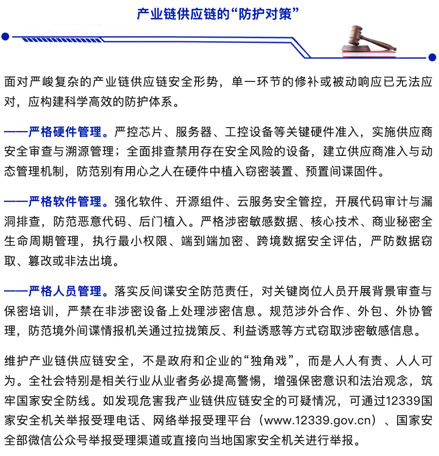 产业链供应链安全事关国家经济安全和高质量发展全局。近年来,境外间谍情报机关针对我国产业链供应链的渗透、破坏与窃密行为日益隐蔽化、专业化、体系化,对我国经济安全、科技安全与数据安全构成严重威胁。