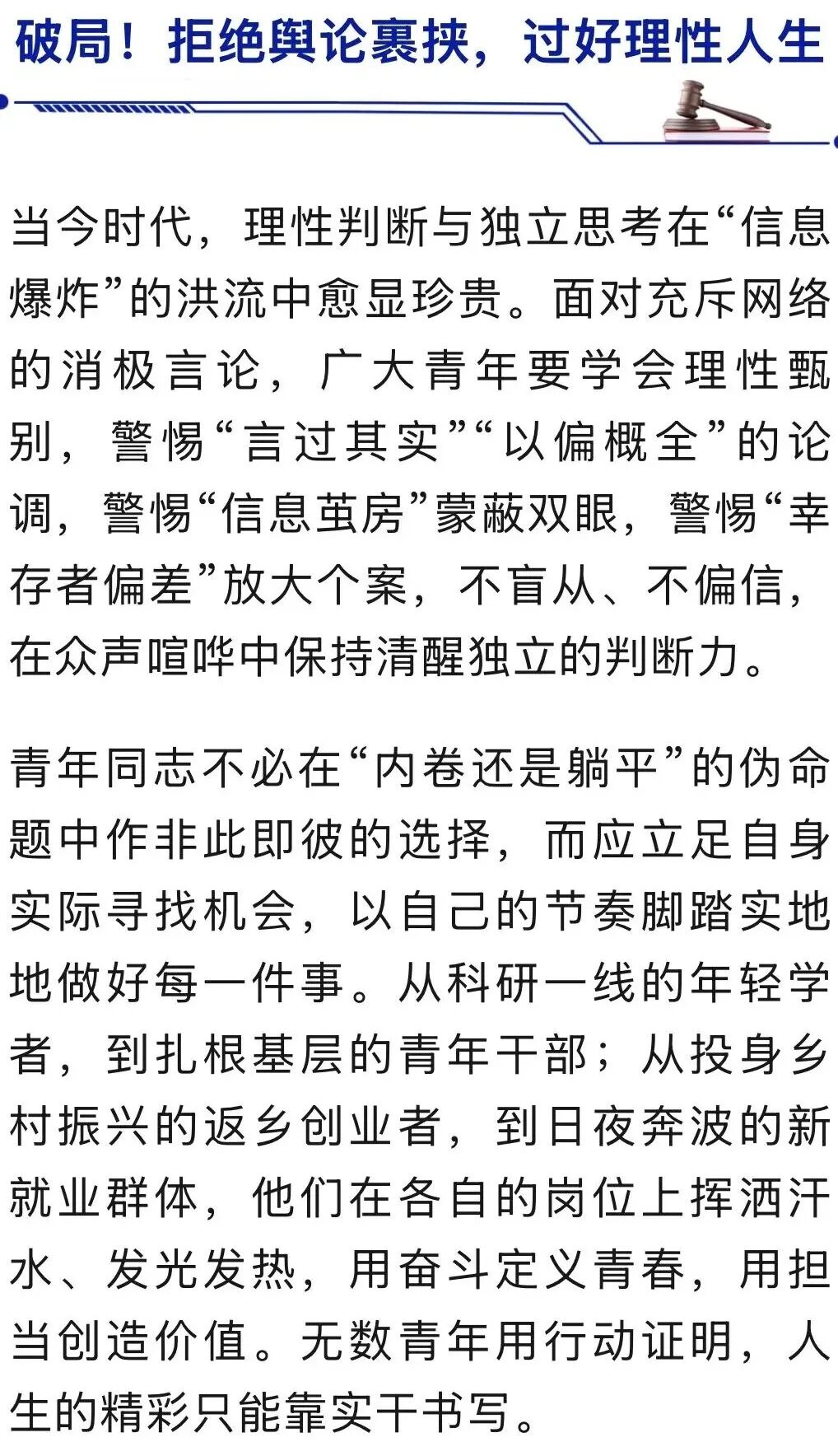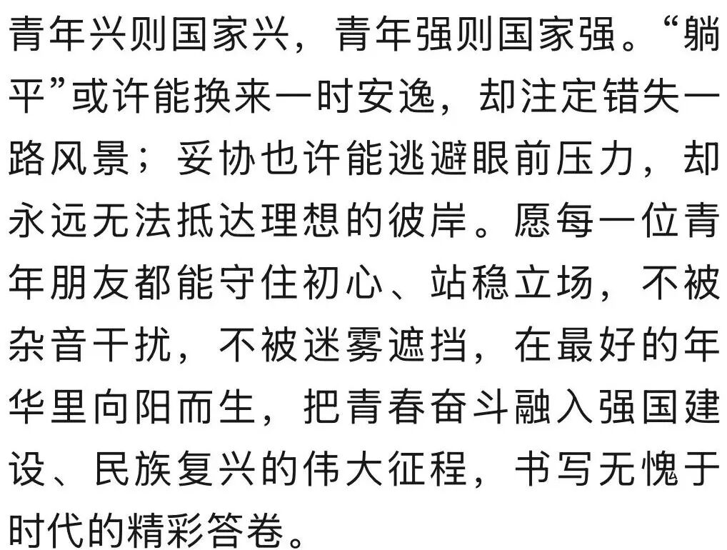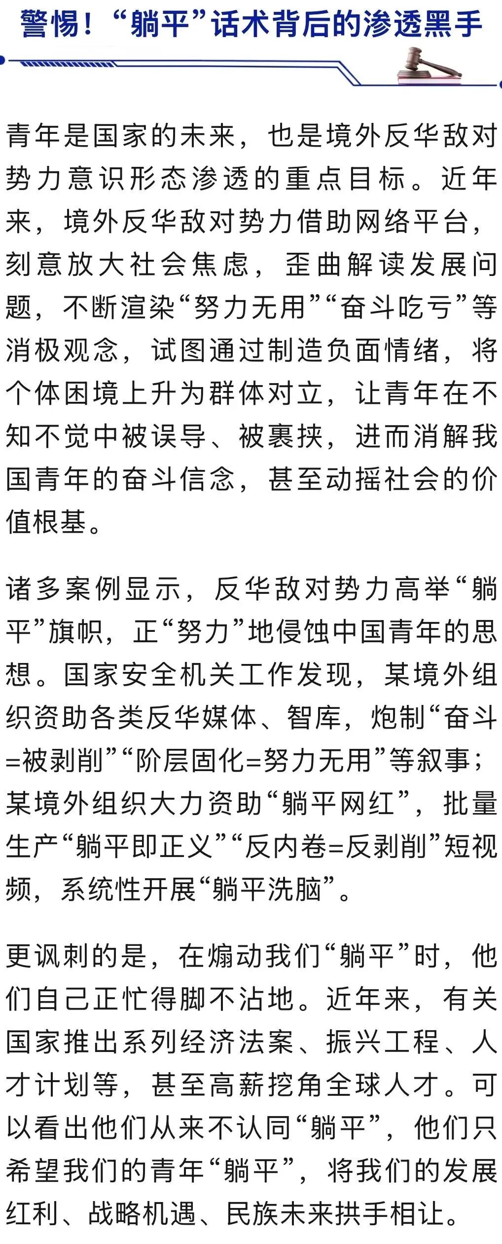 据“国家安全部”4月28日消息,当“卷不动就躺平”频繁见诸网络,当“摆烂是最优解”反复刷屏,身处舆论场的青年难免陷入迷茫。但面对扑面而来的消极情绪,我们必须擦亮双眼、保持清醒,警惕这些看似平常的“躺平”论调背后暗藏的复杂舆论陷阱。