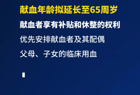 献血法修订公开征意见:献血年龄拟延长至65周岁,献血者享有补贴和休整的权利,优先安排献血者及其配偶、父母、子女的临床用血