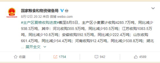 这两天,市场对于夏粮关注热情又上来了!国家粮食和物资储备局8月12日发布的一则“主产区夏粮收购进度”公告。其中提到,小麦产量占全国四分之一的河南省,夏粮收购总量为912.4万吨,同比减少538.8万吨。