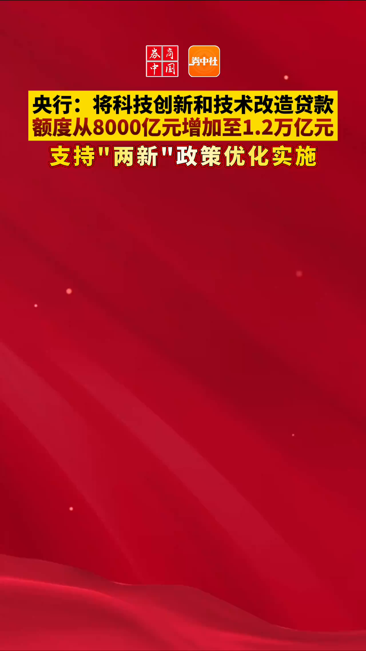 央行:将科技创新和技术改造贷款额度从8000亿元增加至1.2万亿元 支持"两新"政策优化实施