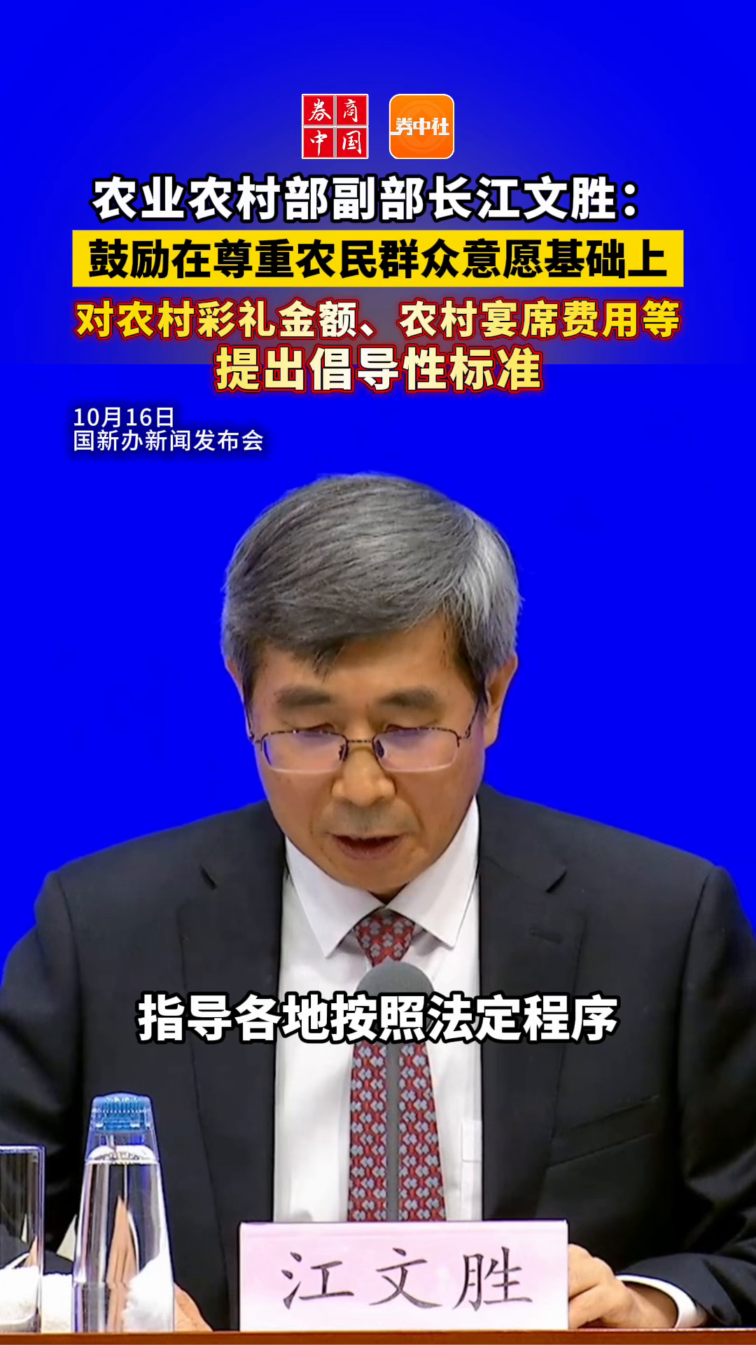 农业农村部副部长江文胜:鼓励在尊重农民群众意愿基础上,对农村彩礼金额、农村宴席费用等提出倡导性标准
