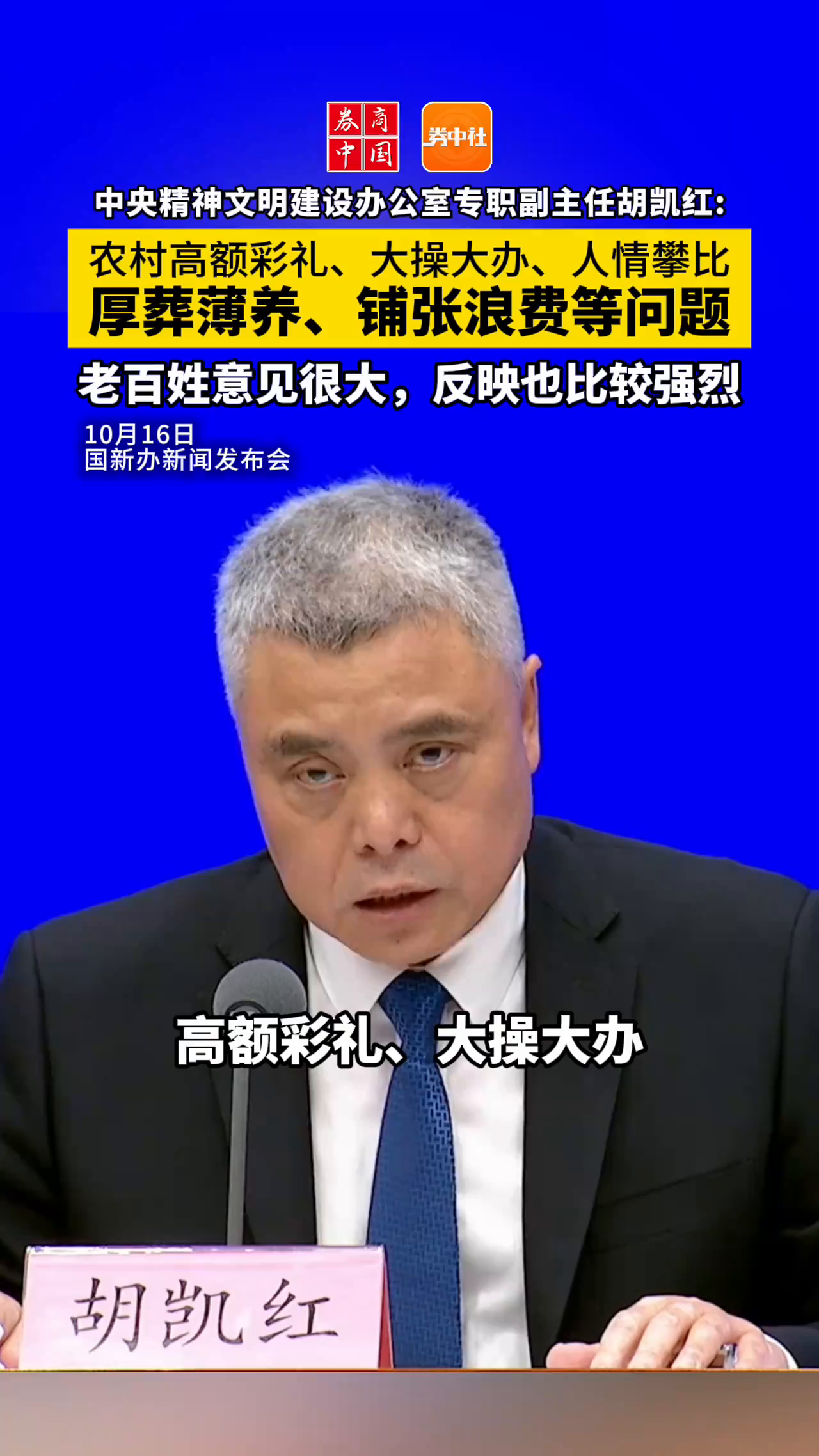 中央精神文明建设办公室专职副主任胡凯红:农村高额彩礼、大操大办、人情攀比、厚葬薄养、铺张浪费等问题,老百姓意见很大,反映也比较强烈