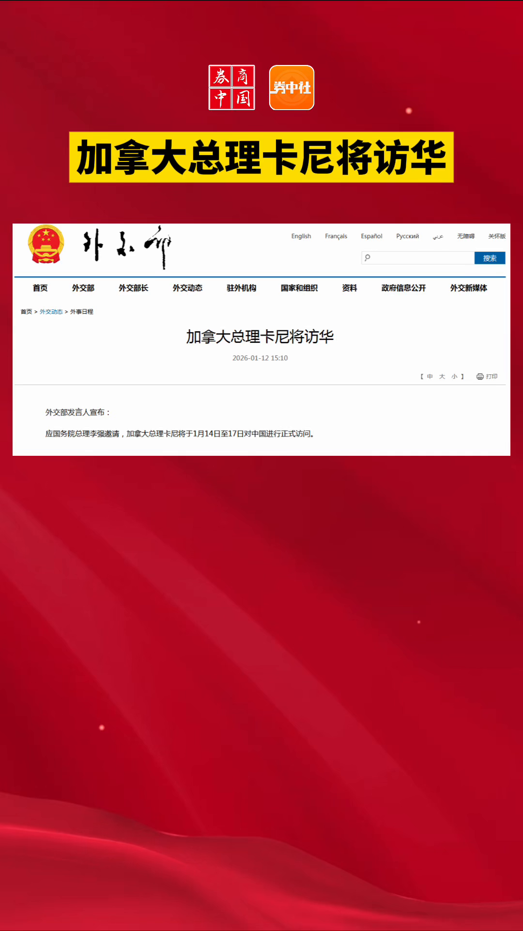 加拿大总理卡尼将访华