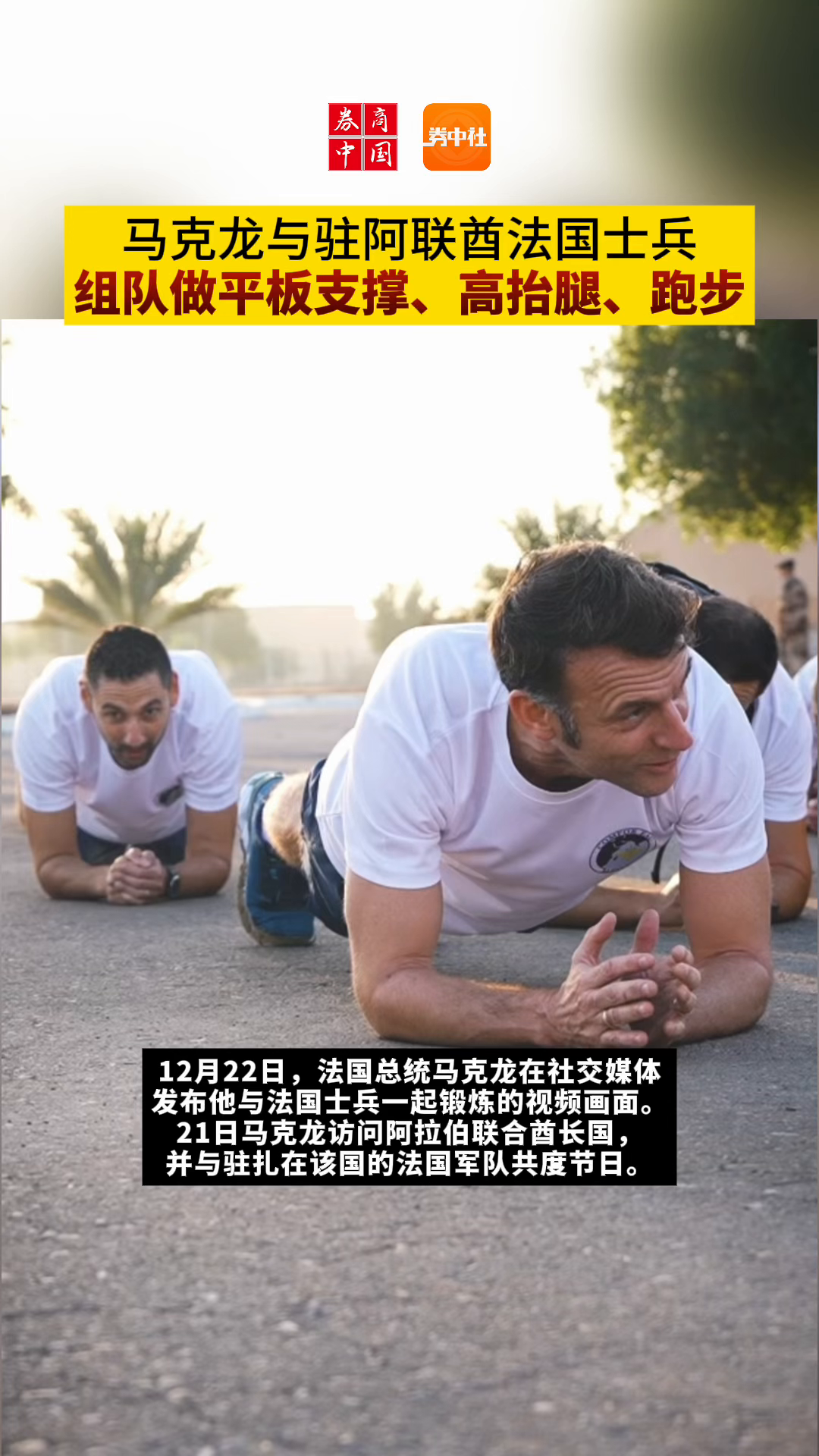 马克龙与驻阿联酋法国士兵组队做平板支撑、高抬腿、跑步