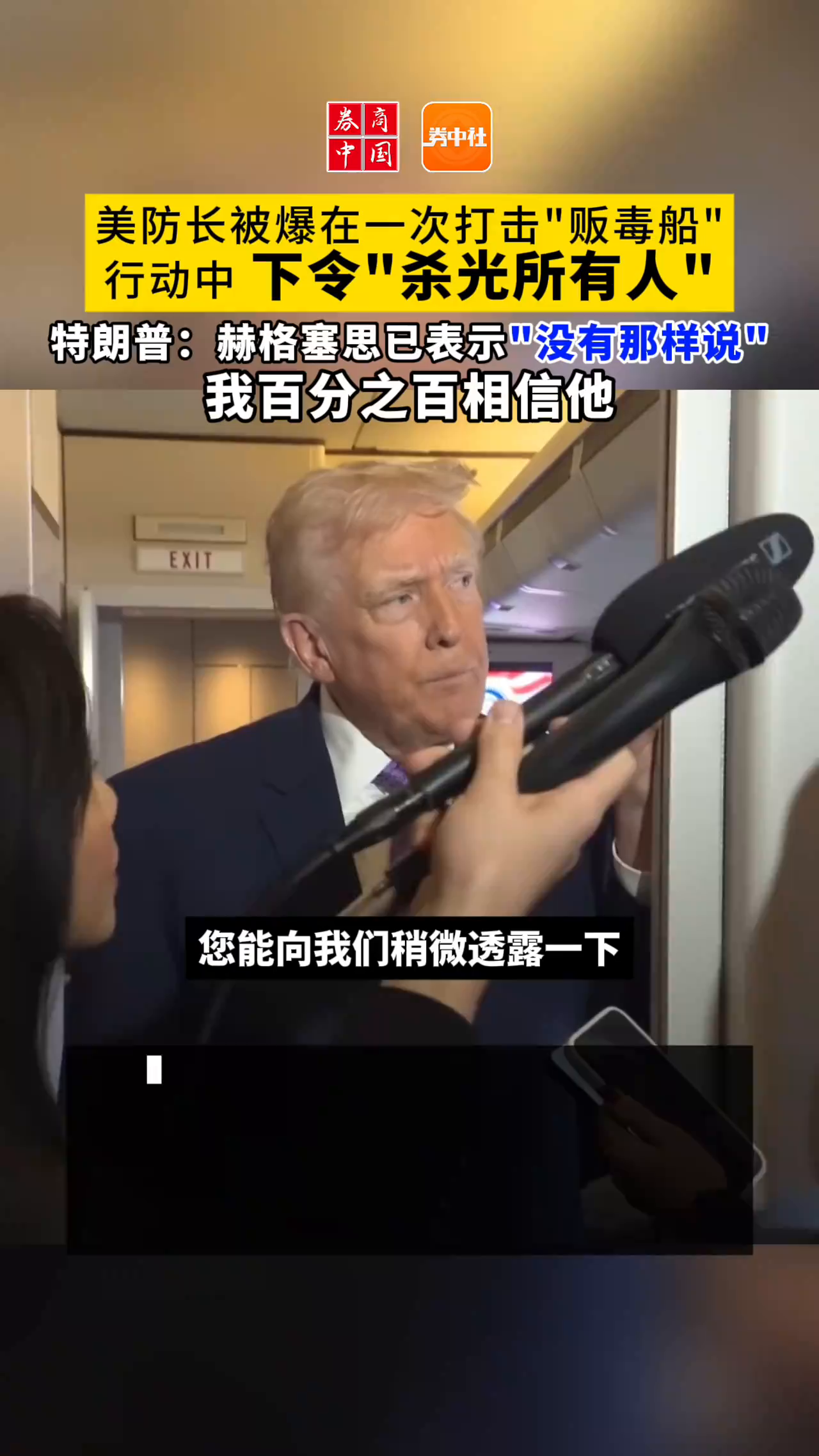 美防长被爆在一次打击"贩毒船"行动中下令"杀光所有人" 特朗普:赫格塞思已表示"没有那样说" 我百分之百相信他