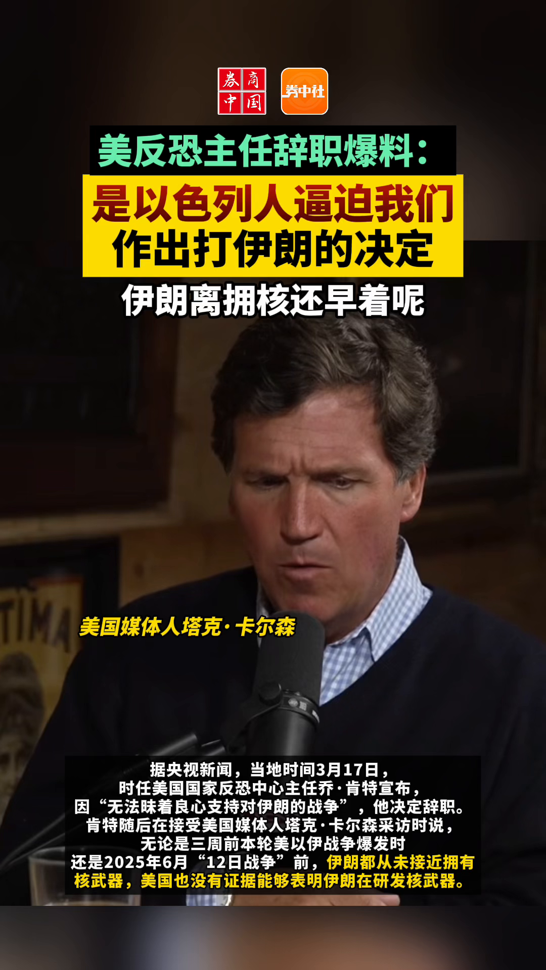 美反恐主任辞职爆料:是以色列人逼迫我们作出打伊朗的决定 伊朗离拥核还早着呢