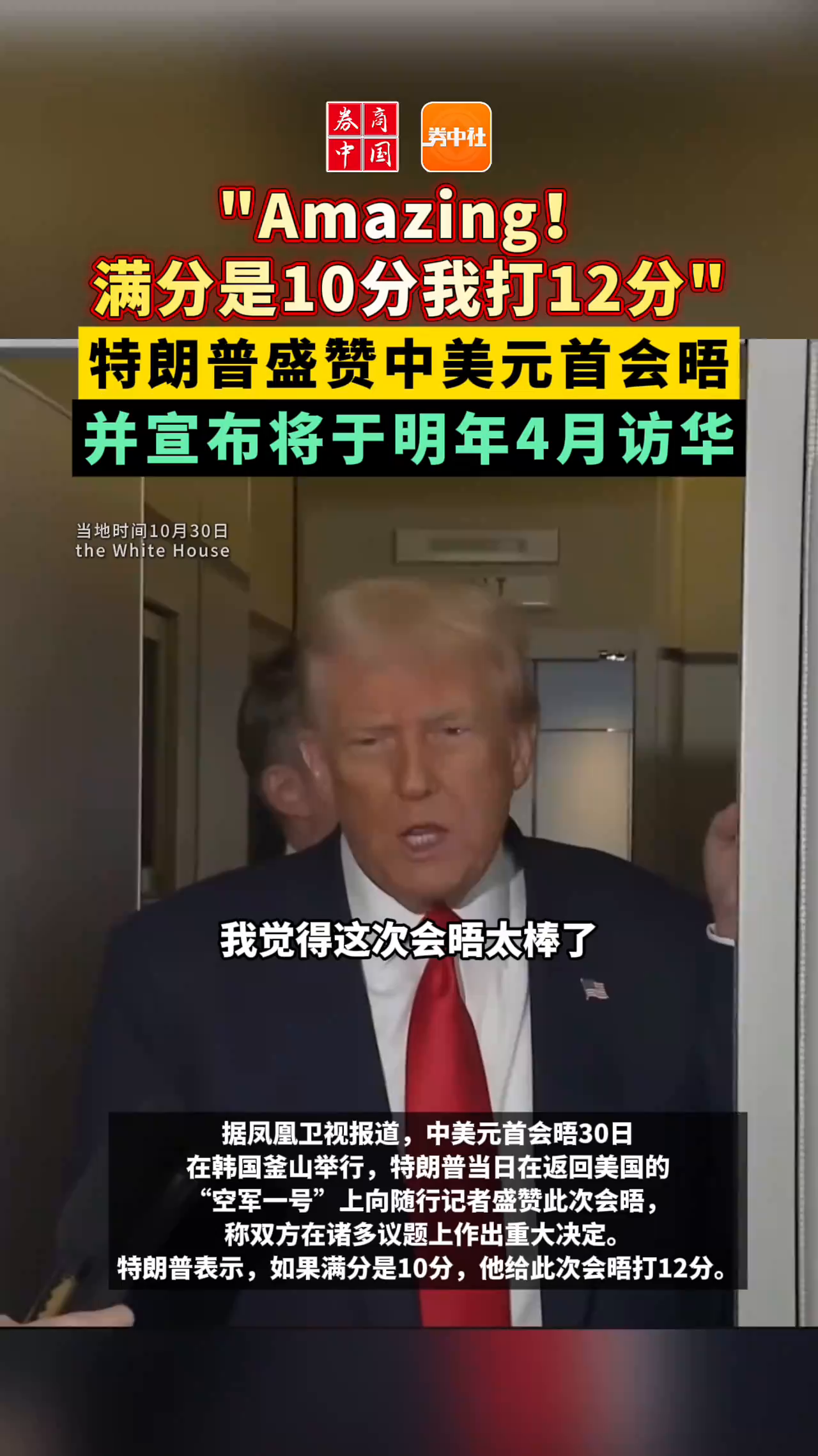 "Amazing!满分是10分我打12分" 特朗普盛赞中美元首会晤 并宣布将于明年4月访华