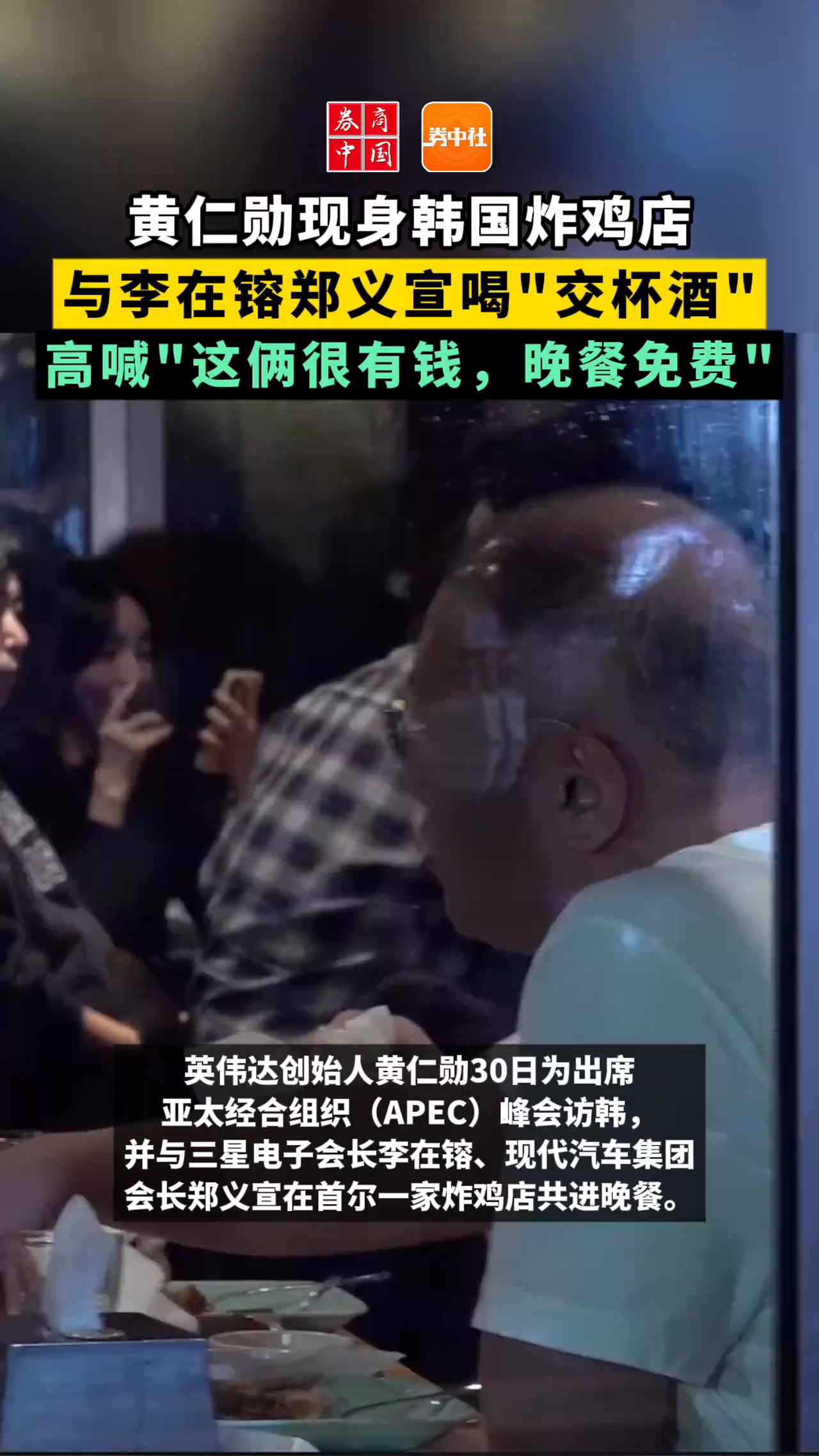 黄仁勋现身韩国炸鸡店 与李在镕郑义宣喝"交杯酒" 高喊"这俩很有钱,晚餐免费"