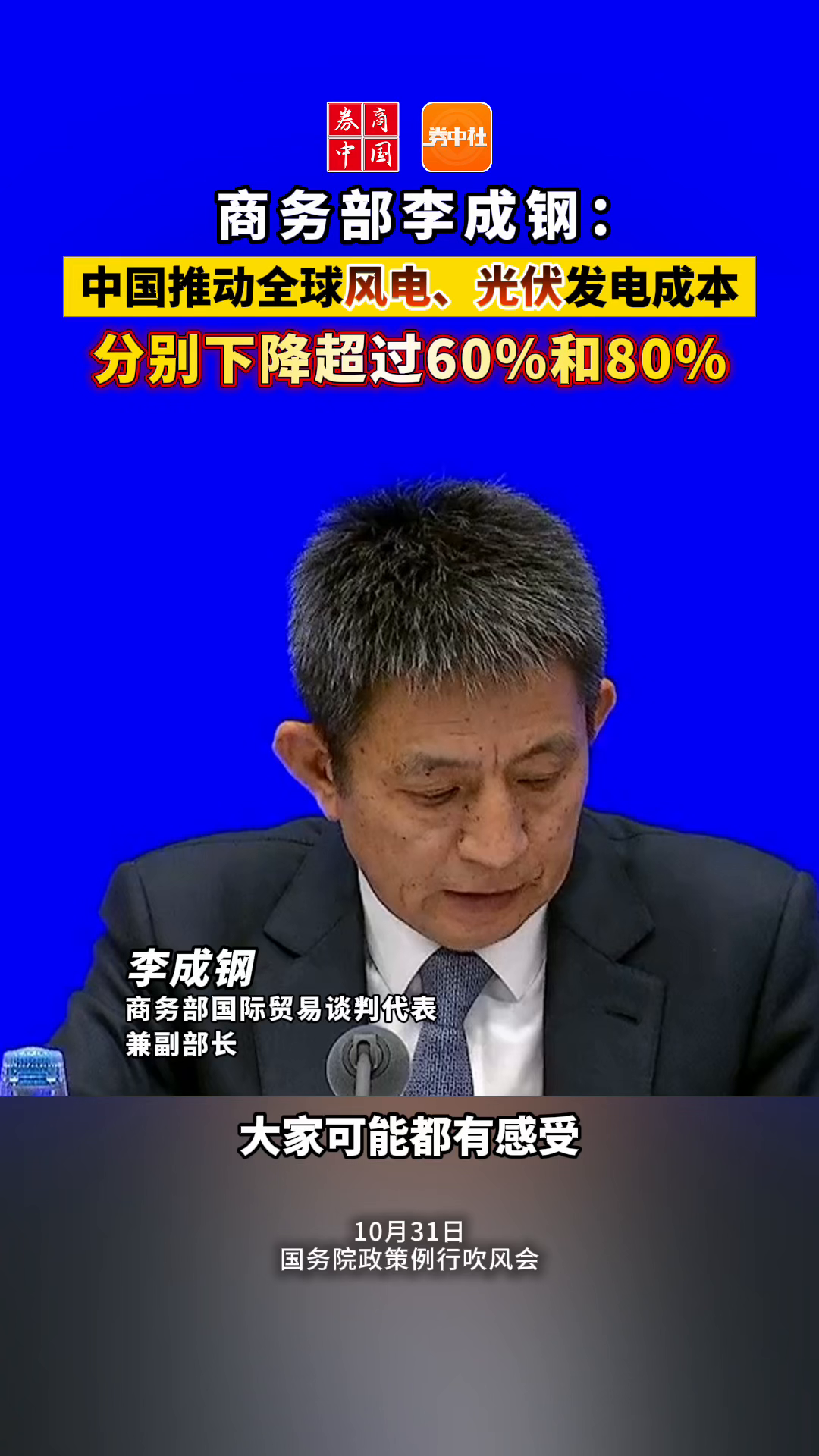 商务部李成钢:中国推动全球风电、光伏发电成本分别下降超过60%和80%