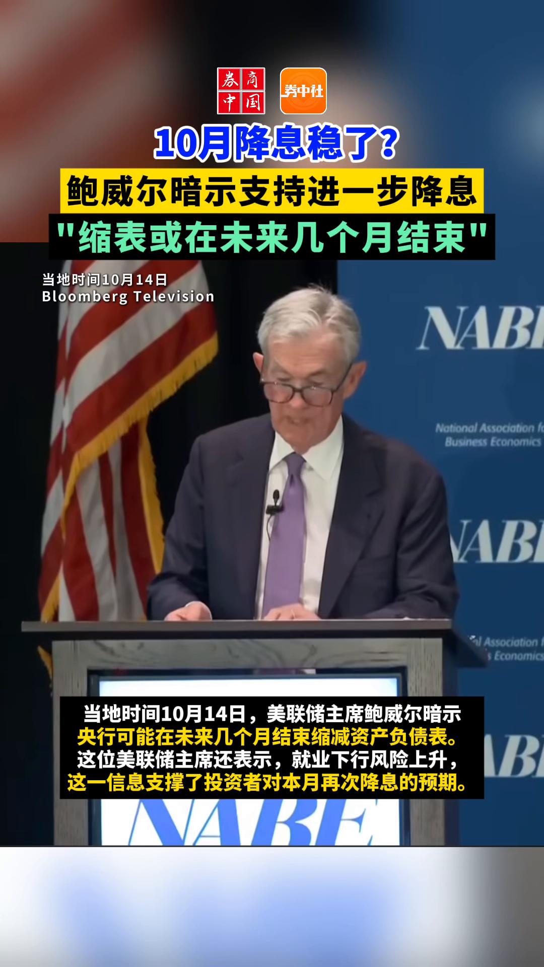 10月降息稳了?鲍威尔暗示支持进一步降息 "缩表或在未来几个月结束"