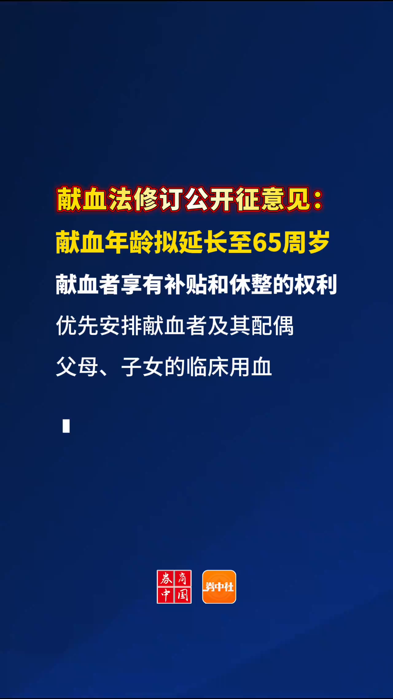 献血法修订公开征意见:献血年龄拟延长至65周岁,献血者享有补贴和休整的权利,优先安排献血者及其配偶、父母、子女的临床用血