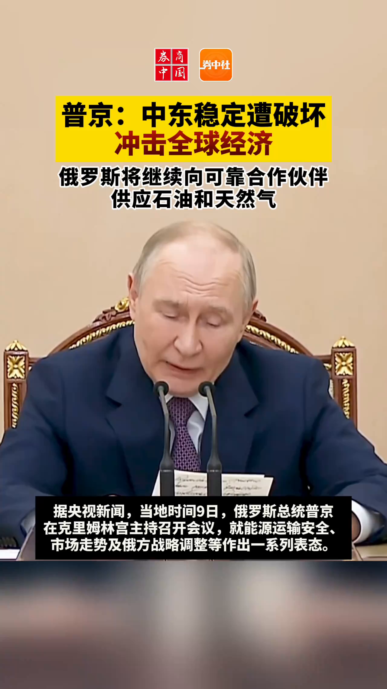 普京:中东稳定遭破坏冲击全球经济 俄罗斯将继续向可靠合作伙伴供应石油和天然气