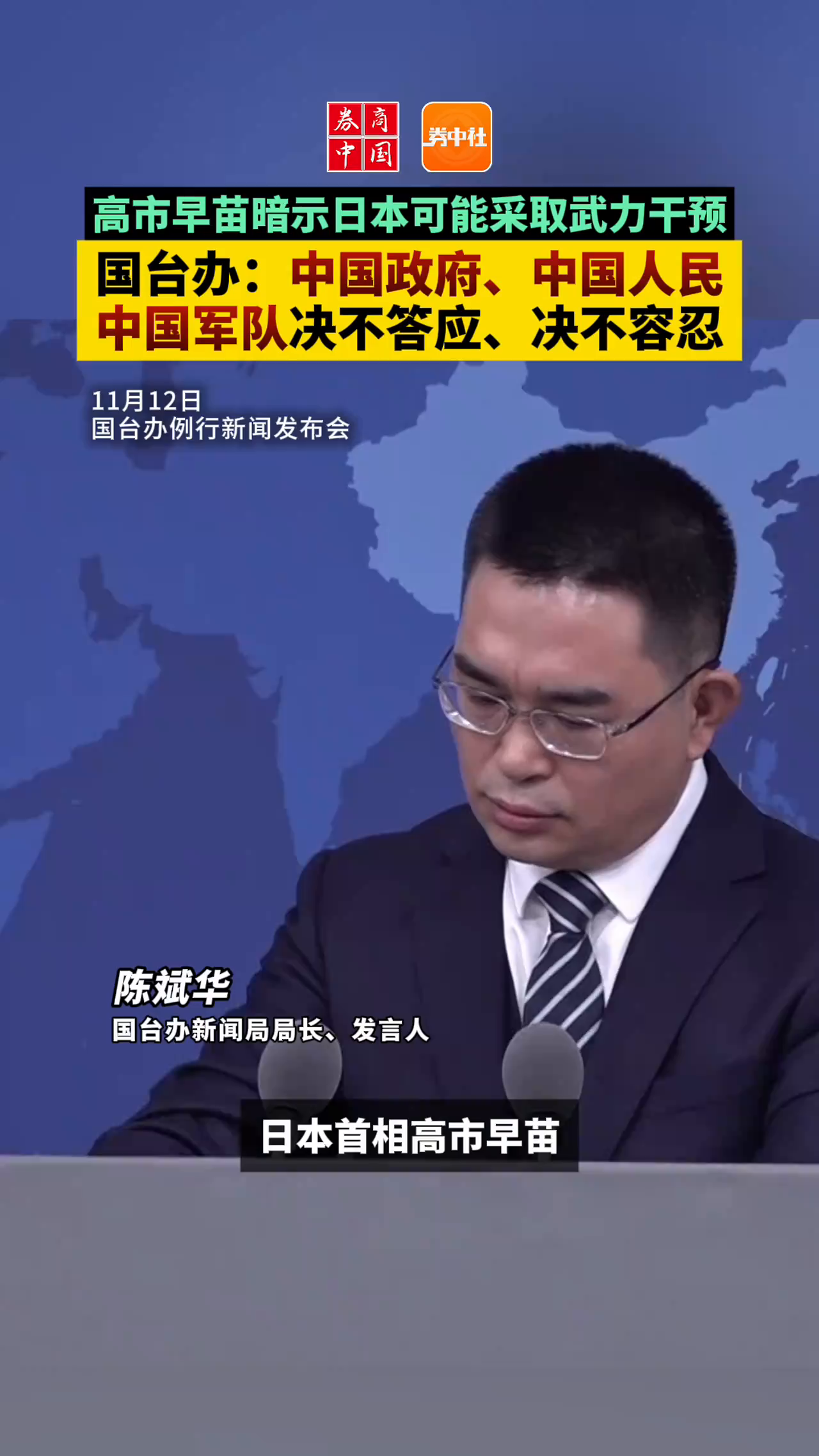 高市早苗暗示日本可能采取武力干预,国台办发言人:中国政府、中国人民、中国军队决不答应、决不容忍